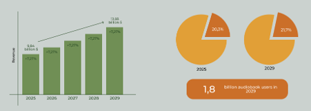 من المتوقع أن يصل عدد مستخدمي الكتب الصوتية حول العالم إلى . كما سيبلغ معدل انتشار الكتب الصوتية بين المستخدمين 20.3% في عام 2025، ليرتفع إلى 21.7% بحلول عام 2029. يعكس نمو السوق الاهتمام المتزايد بطريقة استهلاك الأدب بسهولة، خاصة بين الباحثين عن البساطة
